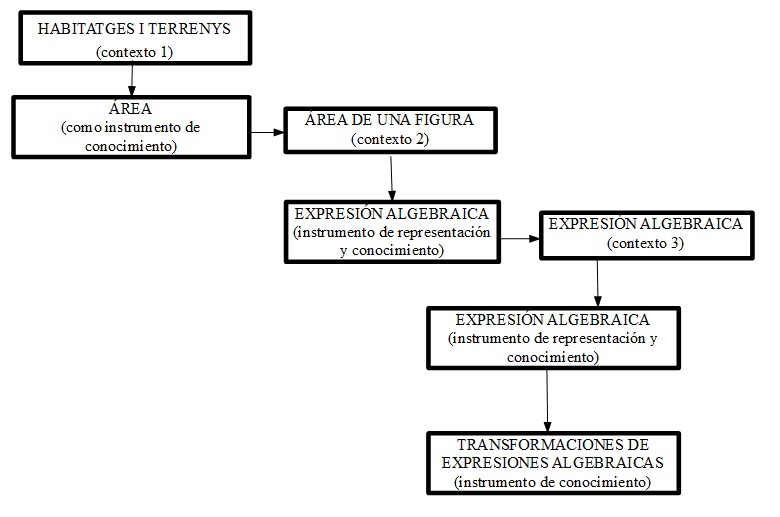 En matemàtiques aquest procés es pot repetir successives vegades, a diferència del que passa en les altres ciències (física, biologia). En aquest sentit, la unitat “Habitatges i Terrenys” explota a fons aquesta possibilitat, contribuint així a caracteritzar les matemàtiques com a ciència autònoma. En aquest sentit, aquesta unitat és l’inici d’un itinerari didàctic que tindrà la seva continuació en tercer curs d’ESO amb l’estudi de les expressions algebraiques, i en quart curs amb l’estudi de les transformacions d’expressions algebraiques, segons s’il·lustra a continuació.